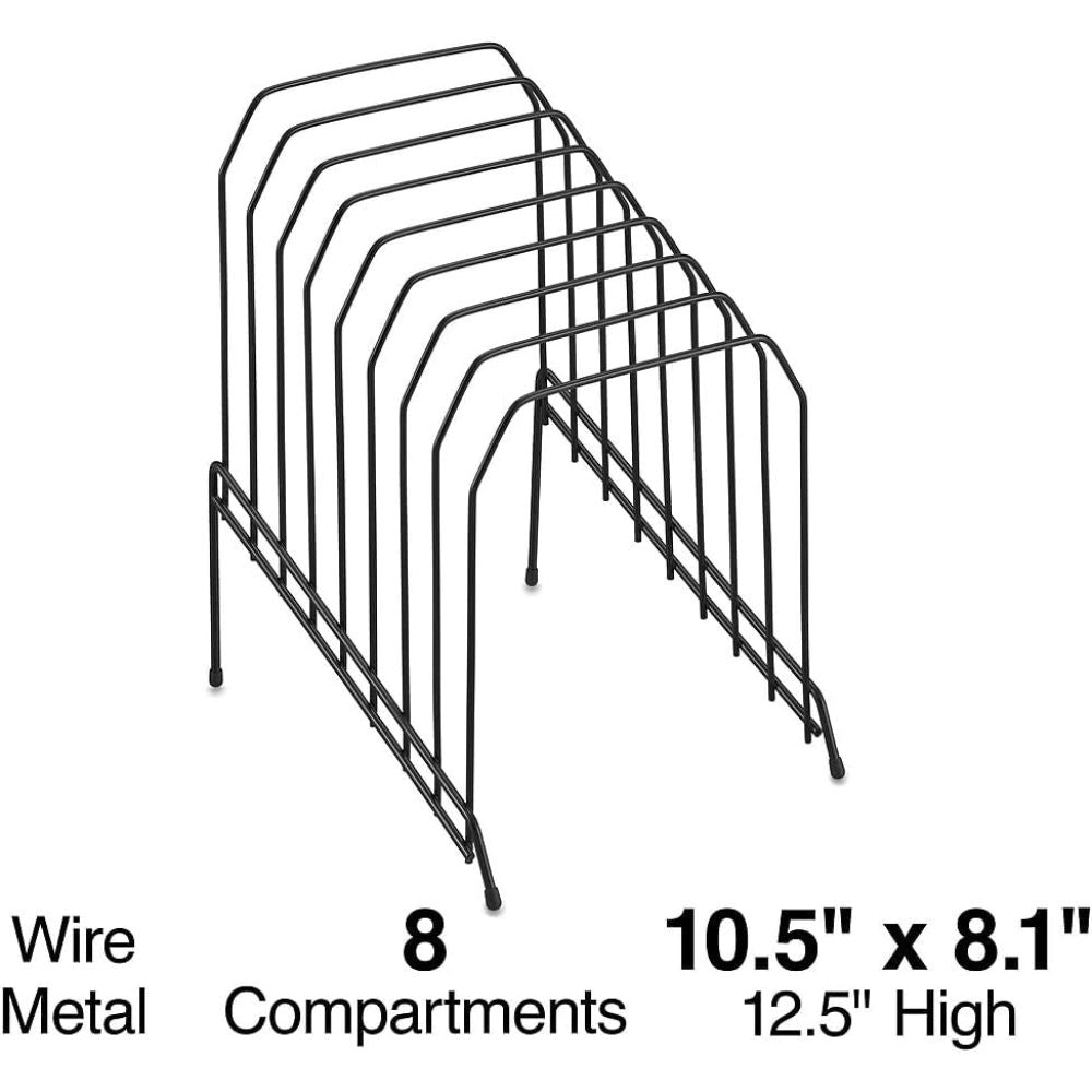 - This desktop file sorter is an ideal decision for organizing mail, folders and loose papers. This sorter has eight compartments. Comes in black color with metal wire construction. Dimensions: 8.5"H x 10.75"W x 13.13"D. This sorter features a graduated, staggered design to keep all your projects visible. Has a vari-spaced dividers. Includes four rubber stops to prevent skidding.